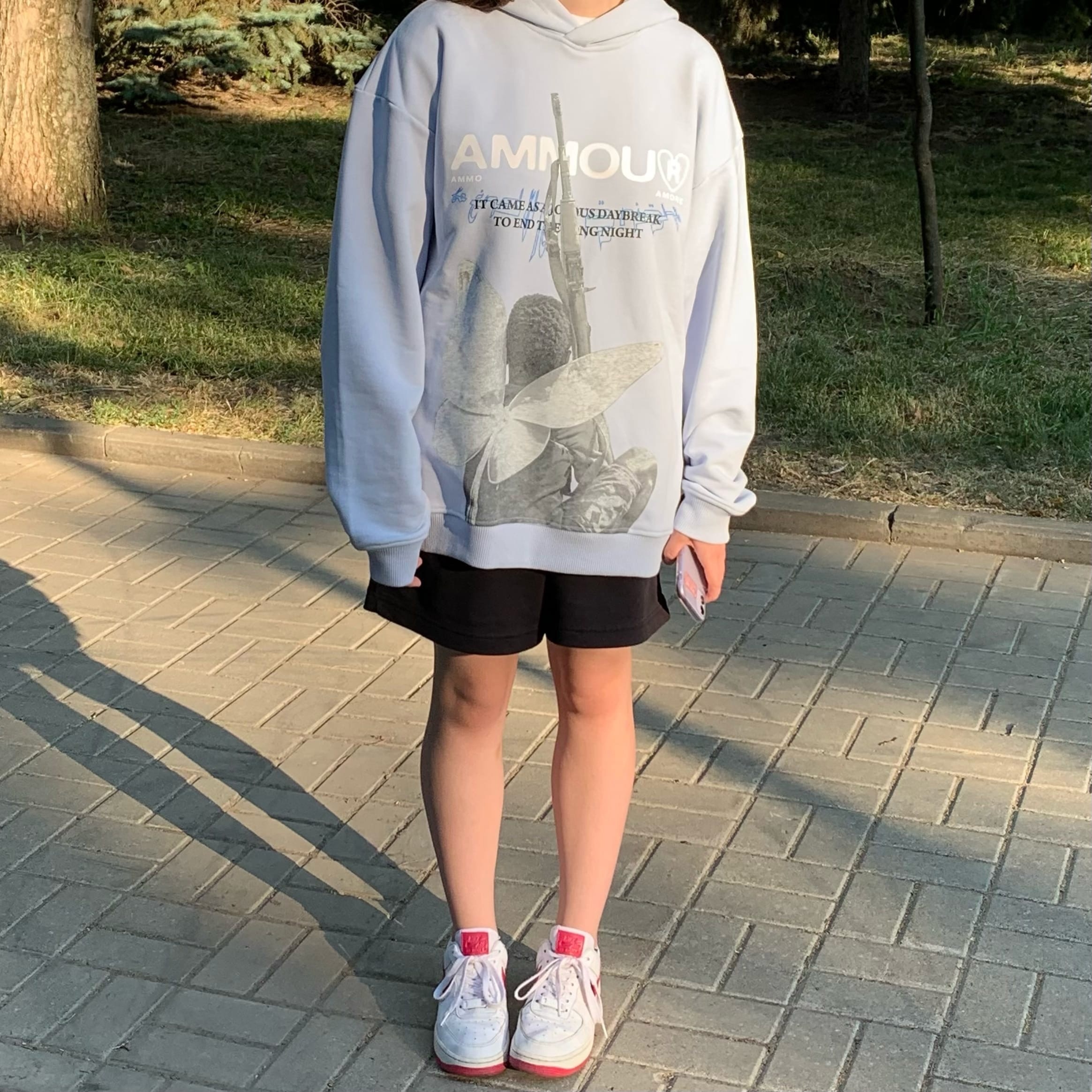 Бренд одежды основан в 2021 году. При создании вещей мы часто обращаемся к эстетике борьбы и любви, наше название как раз таки отсылает к этим двум явлениям (ammo+amore, боеприпасы и любовь). И боеприпасы - это не только про пули и гранаты, а так же внутреннюю энергию живого существа, моральные и ментальные ресурсы каждого из нас.